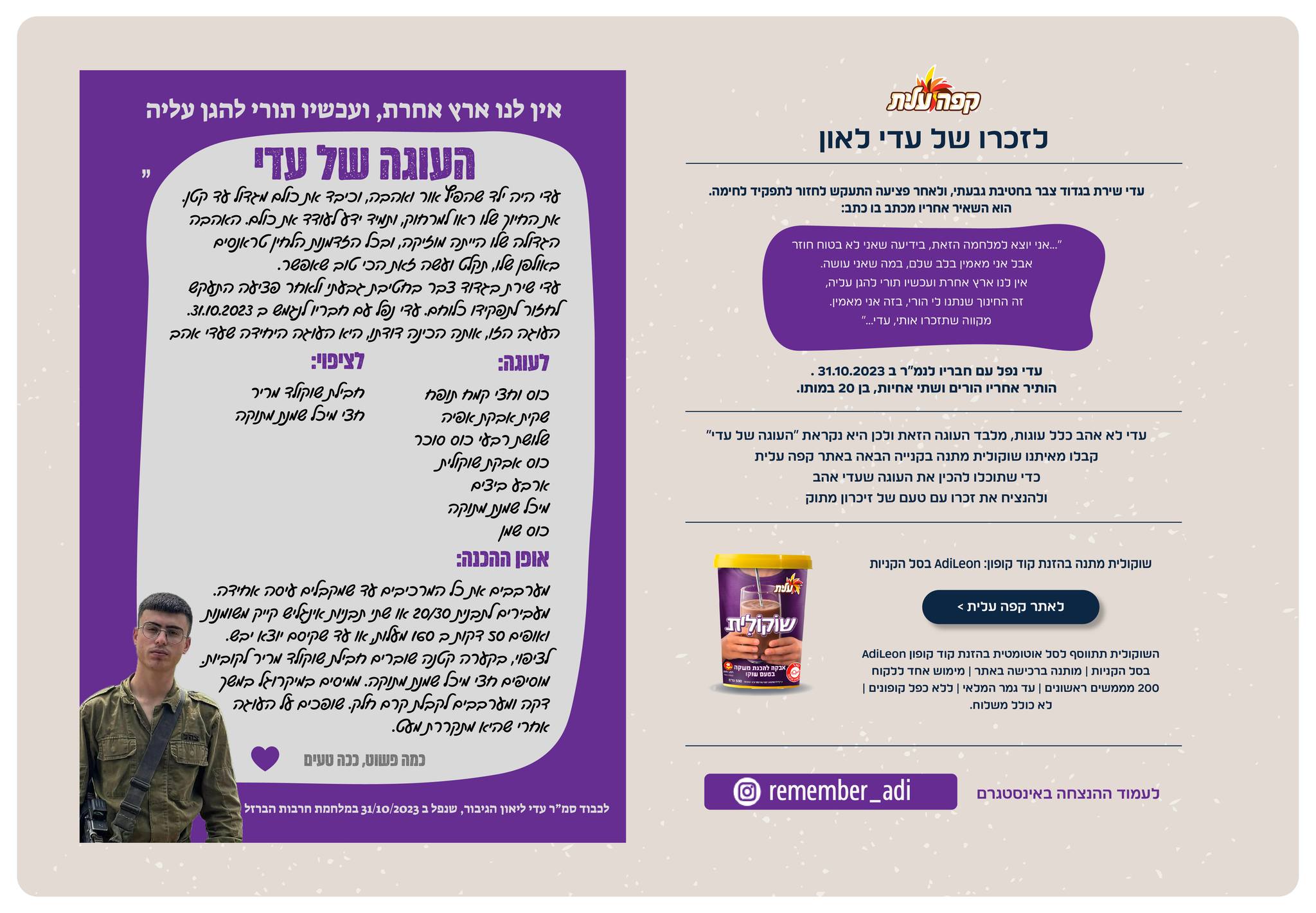 גלויה ללקוחות אתר קפה עלית להזמנה לקנות שוקולית להכנת "העוגה של עדי" לזכר סמ"ר עדי לאון ז"ל-