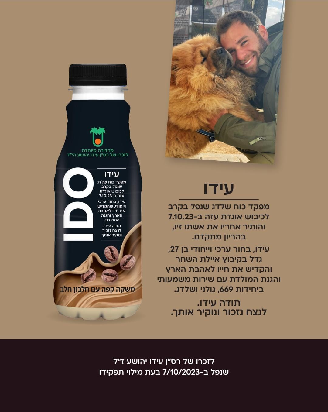 מפקד כוח שלדג שנפל בקרב לכיבוש אוגדת עזה ב7.10 והותיר אחריו את אשתו זיו, בהריון מתקדם. עידו, בחור קסום וייחודי בן 27, גדל בקיבוץ איילת השחר, שירת ביחידות 669, גולני ושלדג והקדיש את חייו לאהבת הארץ והגנת המולדת שכל כך אהב. משפחתו של עידו פנתה למחלבות יטבתה של שטראוס ושיתפה שעידו מאוד אהב את משקה PRO קפה של יטבתה, שייצרה לזכרו כ-1000 בקבוקים עם שמו.