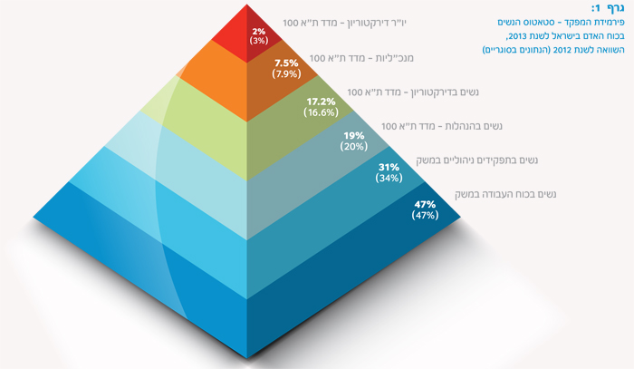 פירמידת המפקד מציגה בפנינו את סיכום הנתונים לשנת 2013. נתוני השנה וכן ההשוואה לשנת 2012, מראים כי תמונת המצב בישראל לגבי מעמדן של נשים בשוק העבודה רחוקה מלהיות שוויונית או הוגנת. לא חל כל שינוי בהשתתפותן הכללית של נשים בשוק העבודה בישראל, והוא עומד על 47%. נשים מהוות כמעט מחצית מכוח העבודה, אך מעמדן בשוק העבודה אינו יציב ואף הולך ונחלש. בחינה מעמיקה של מעמדן של נשים בשוק העבודה מצביעה על פערי שכר, פערי הערכת תפקידים ומקצוע, פערים מהותיים ביציבות תעסוקתית ובמעמדן הכלכלי של נשים בגילאים מבוגרים ולאחר פרישה משוק העבודה. כמו כן, מצבן של נשים בתפקידי שירותים, טיפול ומעמדן כעובדות קבלן לא השתפר מהותית בשנים האחרונות. נתוני מעמדן ונוכחותן של נשים בניהול בכיר במדד ת"א 100 מלמדים אותנו גם על מעמדן של נשים בתפקידי ניהול בכלל המשק, וכן על מעמדן של נשים בשוק התעסוקה בישראל.