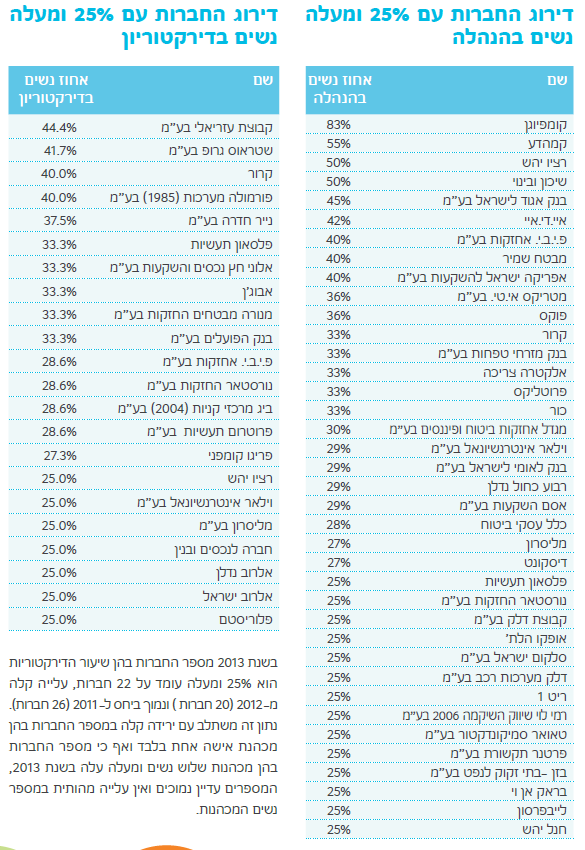 לצד הירידה הניכרת בשדרת הניהול הבכיר, חלה עלייה בשיעור החברות בהן מכהנת יותר מאישה אחת בהנהלת החברה, (43% ב-2013 לעומת 31% ב-2012) וכן נרשמה עלייה באחוז שיעור הנשים בדירקטוריונים (17.2% לעומת 16.6%). עליות נוספות נרשמו בשיעור הנשים המכהנות בדירקטוריון של יותר מחברה אחת, (16% לעומת 11%) וכן בשיעור החברות בהן המנהלות הבכירות מהוות יותר מרבע מההנהלה (38% השנה לעומת 35% בשנה שעברה). יחד עם זאת, מספר החברות בהן נשים מהוות 40% מהנהלתן הבכירה, ירד ב-5% מ-14 חברות בשנת 2012 ל-9 חברות בלבד, בשנת 2013.