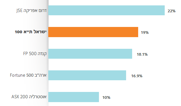 בישראל 19% מתפקידי הניהול בהנהלות החברות מאוישים על ידי נשים, (ירידה של 1% לעומת שנת 2012 בה נרשמו 20%) אחוז זה מעט נמוך מאחוז הנשים בתפקידי ניהול בהנהלת דרום אפריקה, (22%) וגבוה מזה שבארה"ב, קנדה ואוסטרליה.