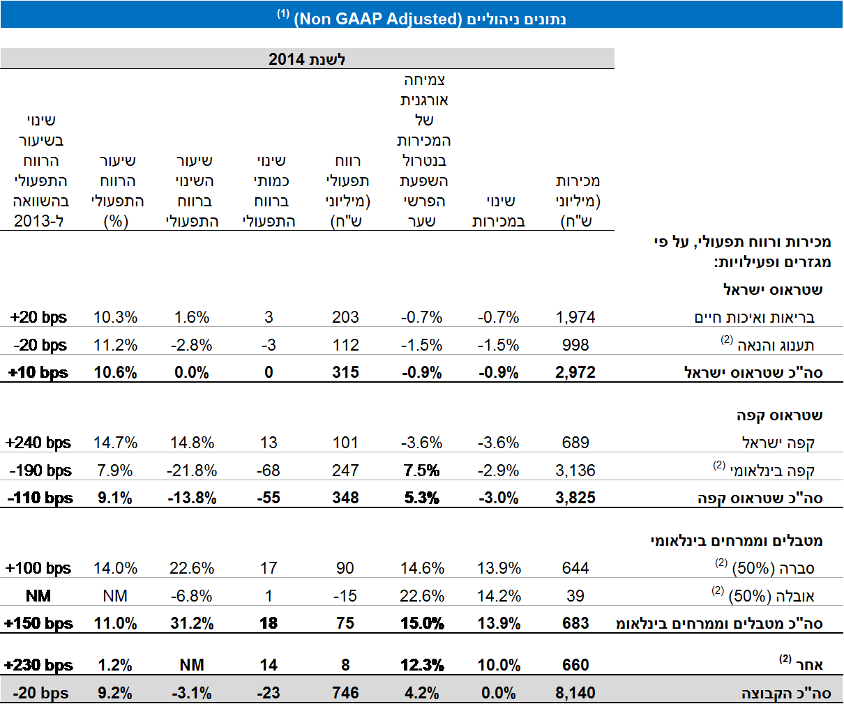 - (2) נתוני תענוג והנאה כוללים את חלקה של שטראוס (50%) בחטיפים המלוחים. נתוני קפה בינלאומי כוללים את חלקה של שטראוס (50%) ב – (Três Corações (3C – ברזיל (חברה בשליטה משותפת (50%) של הקבוצה ושל קבוצת São Miguel המקומית – (50%). נתוני מטבלים וממרחים בינלאומי משקפים את חלקה של שטראוס (50%) בסברה ובאובלה. נתוני "אחר" כוללים את חלקה של שטראוס בשטראוס מים סין(50%).