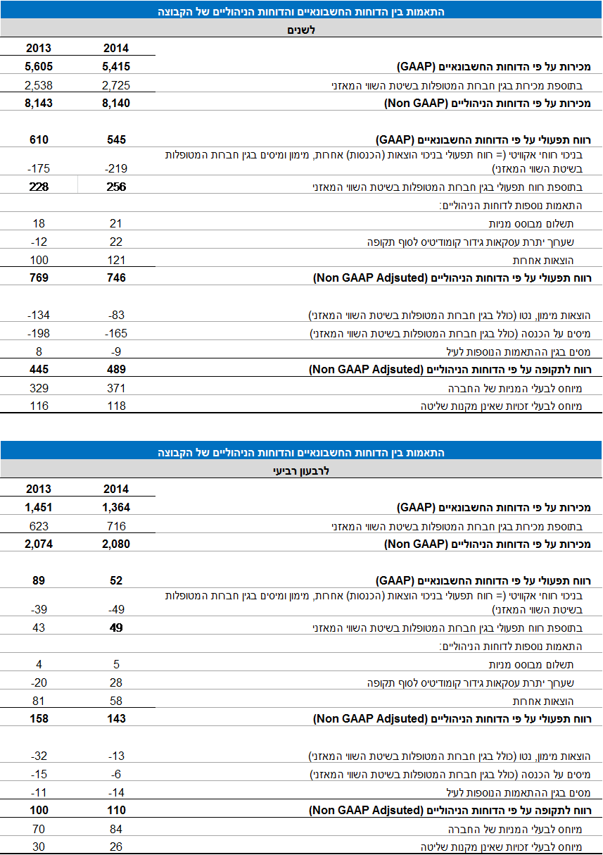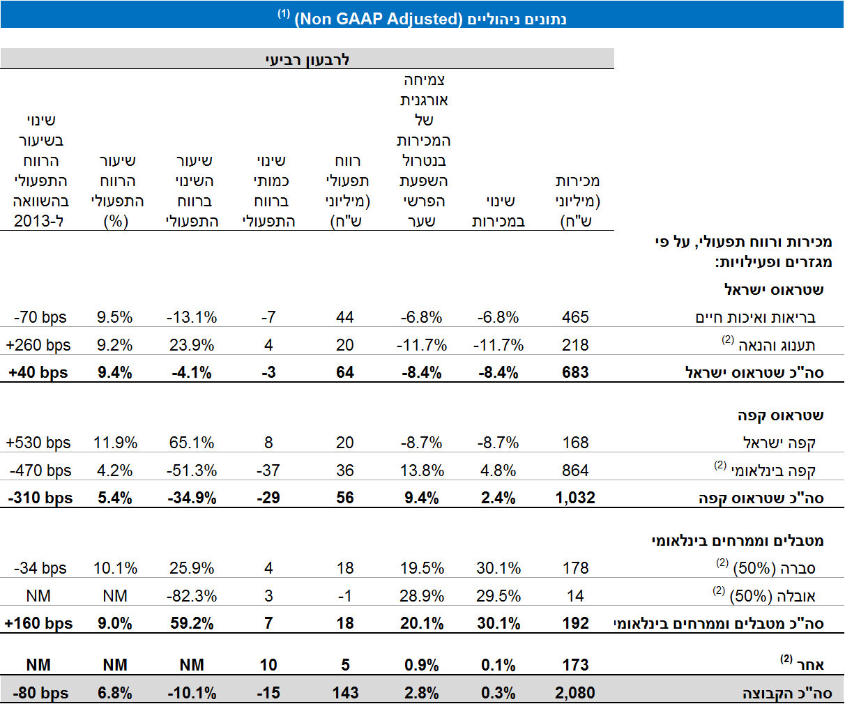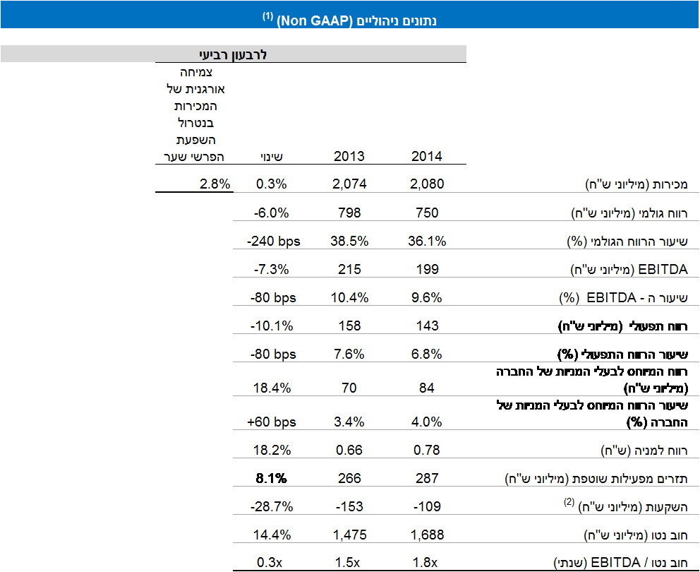 (1) מבוסס על הנתונים הניהוליים (Non GAAP) הכוללים איחוד יחסי של שותפויות בשליטה משותפת (ללא יישום תקן בינלאומי 11) ונטרול של הפריטים הבאים: תשלום מבוסס מניות, שערוך יתרת עסקאות גידור קומודיטיס לסוף תקופה והכנסות והוצאות אחרות, למעט אם מצוין אחרת.