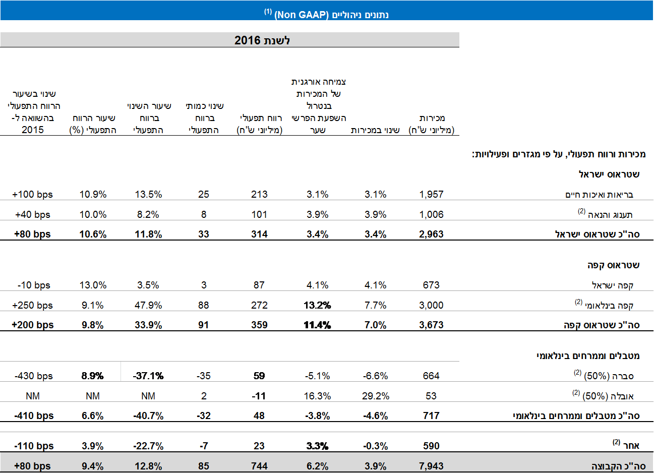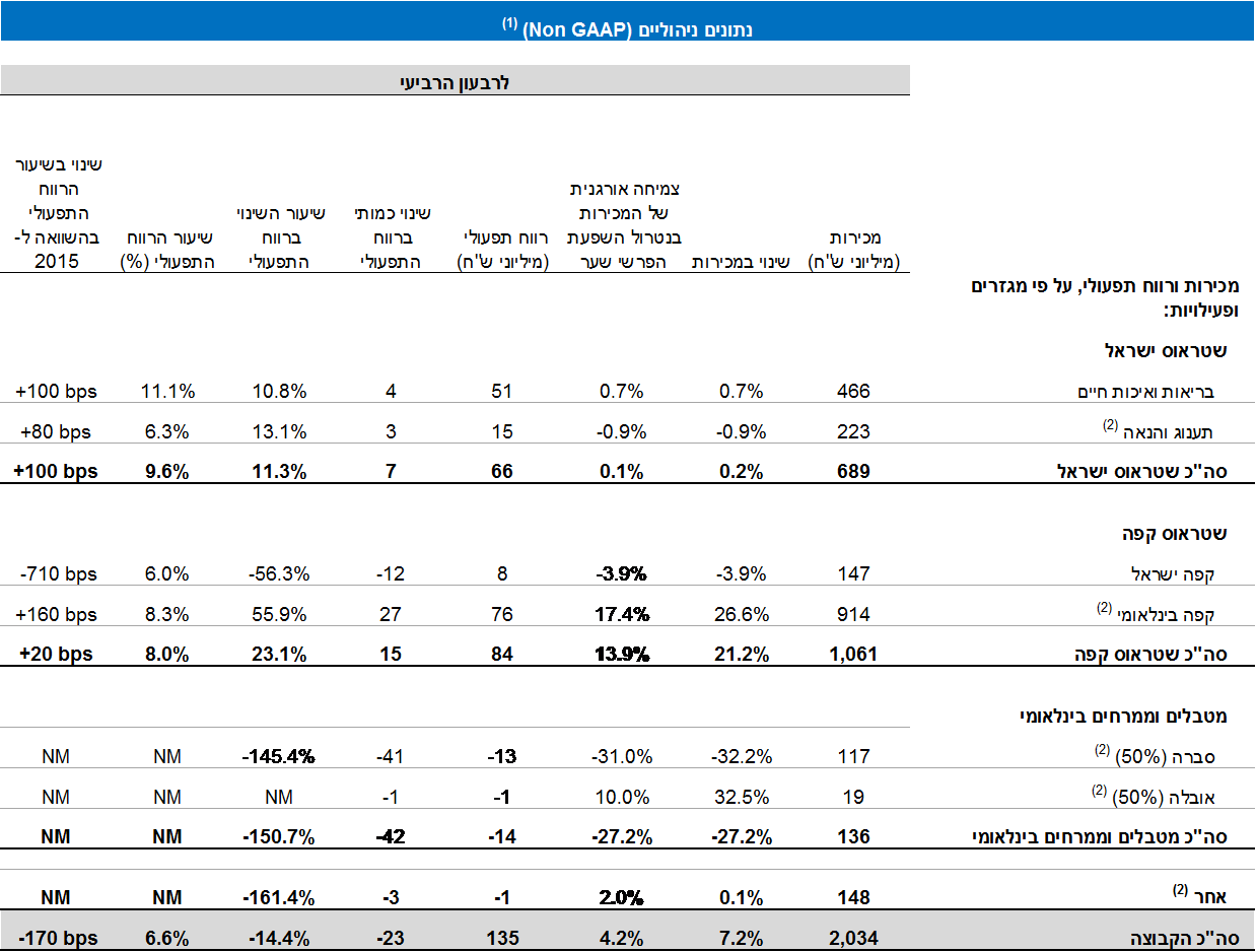 (2) נתוני תענוג והנאה כוללים את חלקה של שטראוס (50%) בחטיפים המלוחים. נתוני קפה בינלאומי כוללים את חלקה של שטראוס (50%) ב – (Três Corações (3C – ברזיל (חברה בשליטה משותפת (50%) של הקבוצה ושל קבוצת São Miguel המקומית – ((50%). נתוני מטבלים וממרחים בינלאומי משקפים את חלקה של שטראוס (50%) בסברה ובאובלה.