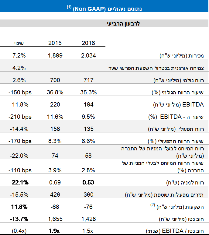 - הצמיחה האורגנית במכירות החברה, בנטרול השפעת השינוי בשערי החליפין הסתכמה בכ- 4.2%. המכירות בש"ח הסתכמו בכ- 2 מיליארד ש"ח, בהשוואה ל- 1.9 בתקופה המקבילה אשתקד, והושפעו מהפרשי תרגום חיוביים בסך של כ- 42 מיליון ש"ח, כתוצאה מהמשך התחזקות שער הריאל הברזילאי אל מול השקל.