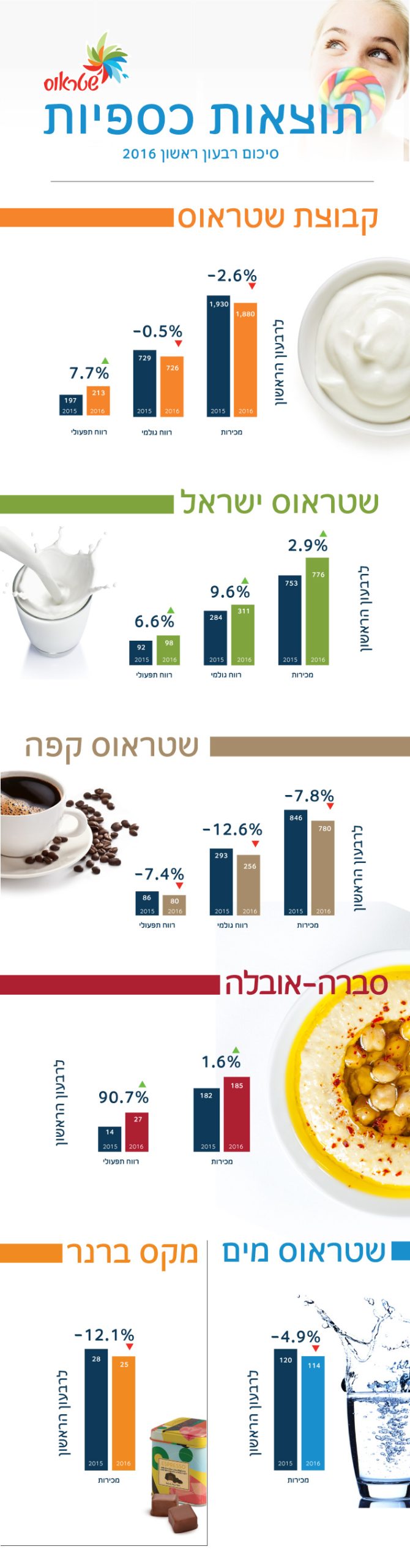שטראוס מסכמת רבעון ראשון חזק של 2016 עם עליה של 7.7% ברווח התפעולי וגידול של 5.1% ברווח הנקי. השפעות המטבע הביאו לירידה של 2.6% במכירות הקבוצה בש"ח; בנטרול השפעות מטבע צמחו מכירות הקבוצה ב- 4.7%.