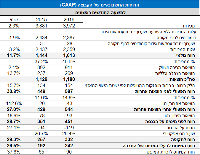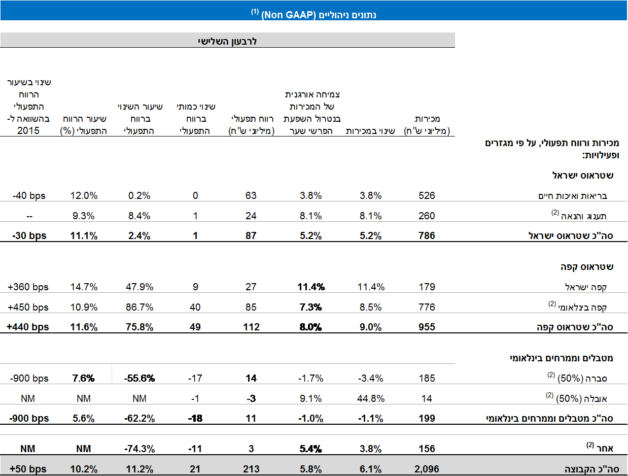 קבוצת שטראוס מסכמת רבעון חזק עם צמיחה אורגנית של 5.8% במכירות ורווח תפעולי ניהולי של 213 מיליון ש"ח המהווה צמיחה של 11.2%, המצטרף לצמיחה אורגנית משמעותית של 7.1% במכירות תוך שיפור משמעותי ברווח התפעולי לכדי 609 מיליון ש"ח המהווה צמיחה של כ-21.4% בתשעת החודשים הראשונים של שנת 2016 (1)