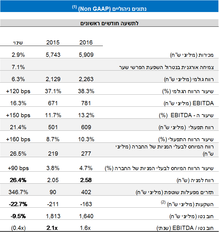 (1) הנתונים הינם נתונים מהדוחות הניהוליים (Non GAAP) של החברה הכוללים איחוד יחסי של חברות מוחזקות בשליטה משותפת (ללא יישום תקן בינלאומי 11) ונטרול של הפריטים הבאים: תשלום מבוסס מניות, שערוך יתרת עסקאות גידור קומודיטיס לסוף תקופה והכנסות והוצאות אחרות, למעט אם מצוין אחרת.
