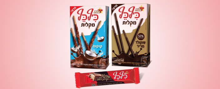 - כיף כף מקלות ביסקוויט מצופים בשוקולד חלב ושבבי קוקוס וכיף כף מקלות ביסקוויט קקאו מצופים בשוקולד מריר מעולה 50% מוצקי קקאו במחיר מומלץ 5.50 ₪ לאריזה של 40 גרם