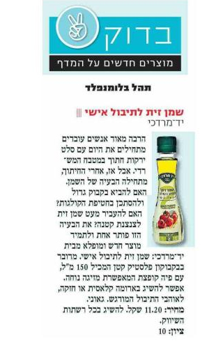 ניצן ישראלי, מנכ"ל יד מרדכי, אמר היום: "יד מרדכי הופכת את שמן הזית לזמין יותר עבור צרכני שמן הזית, ומציעה בקבוקון שמן הזית לתיבול אישי המאפשר תיבול בשמן זית בצלחת האישית על שולחן האוכל"