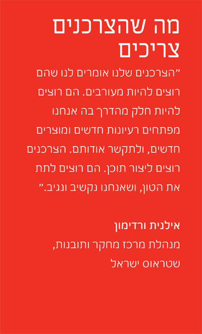 ב-2013 הגענו אל למעלה מ-80,000 צרכנים בישראל במסגרת יותר מ-30 מחקרי שוק ייחודיים ספציפיים. אנחנו עושים שימוש במגוון ערוצים, כולל המדיה החברתית, קבוצות מיקוד, סקרים אינטרנטיים וראיונות ממוקדים. אנחנו מאמצים באופן שוטף את הטכנולוגיות ואת המתודולוגיות המתקדמות והעדכניות ביותר, כדי לסייע לנו לפתח הבנה עמוקה עוד יותר של הדרך בה הצרכנים רוצים לאמץ אורח חיים בריא יותר ושל נושאים נוספים שהם בעלי חשיבות עבורם.